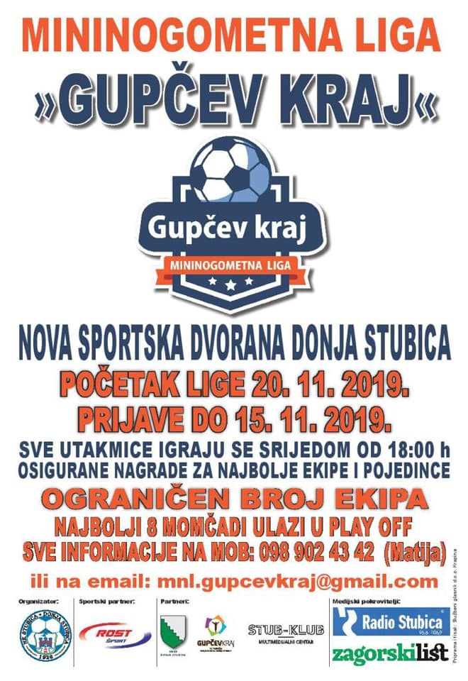 U organizaciji NK Stubica u sportskoj dvorani u Donjoj Stubici održat će se četvrto izdanje mininogometne lige "Gupčev kraj". Prijave traju do 15. 11., a prvo kolo novog izdanje lige bit će održano 20. studenog. Liga će se kao i prijašnjih godina igrati srijedom, s početkom u 18 sati. Organizator je već sada zaprimio deset prijava, tako da je ostalo još samo nekoliko mjesta za prijavu. Prošlo izdanje pripalo je momčadi La-ro promet iz Brestovca Orehovičkog.