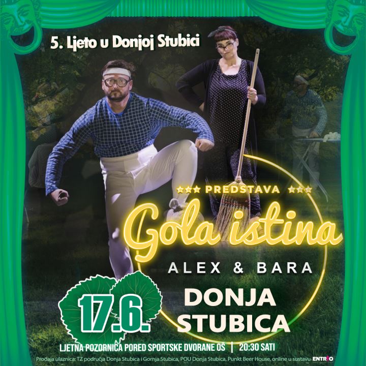 Aleksandar Lazić i Bara u subotu, 17. lipnja nasmijat će vas u predstavi „Gola istina“. Ne propustite ovu novu hit predstavu koja ne izlazi iz glave. Predstava je to koja, kako kaže sam Aleksandar - muškarcima otvara oči, a ženama diže ego do ibera.
