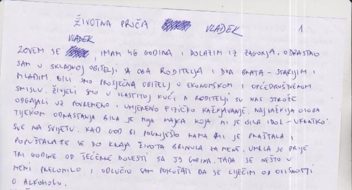 'Vladek (46) iz Zagorja' u terapijskoj je zajednici zbog problema s alkoholom. Srednju školu je napustio i sa 16 godina već počeo raditi na građevini gdje je često konzumirao alkohol. - Alkohol je bio dio moje svakodnevice već od najranijeg djetinjstva. U komuni sam shvatio da je problem u meni i da sam alkoholom pokušavao ispuniti prazninu koju sam osjećao. U terapijskoj zajednici sam već godinu dana, promijenio sam loše i usvojio dobre navike. Sada uistinu bolje shvaćam sebe i druge ovisnike i sada znam da je alkoholizam uistinu bolest – ispričao je Vladek.