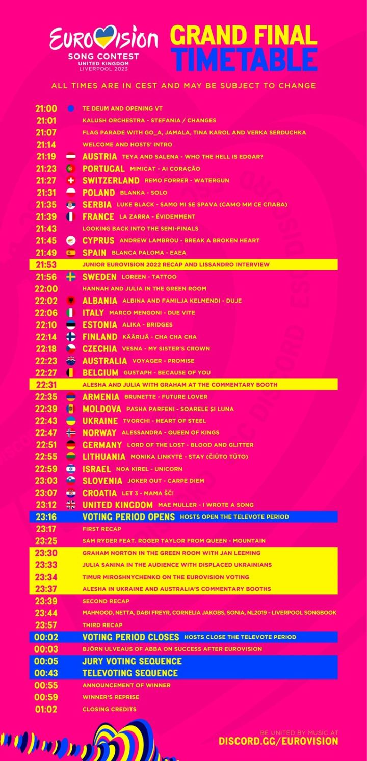 S Eurovizije su objavili detaljni raspored nastupa koji otkriva da će brkati Riječani nastupiti u 23:07, a proglašenje pobjednika očekuje se oko 1 sat.