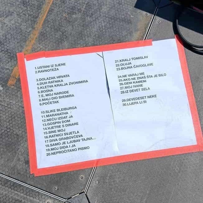 Internetom se proširila fotografija navodnog popisa pjesama koje će Marko Perković Thompson pjevati na sutrašnjem koncertu na zagrebačkom Hipodromu. Mediji pišu da je lista vjerojatno procurila s tonske probe, no zasad nije potvrđeno je li to doista prava lista pjesama, prenosi Index.