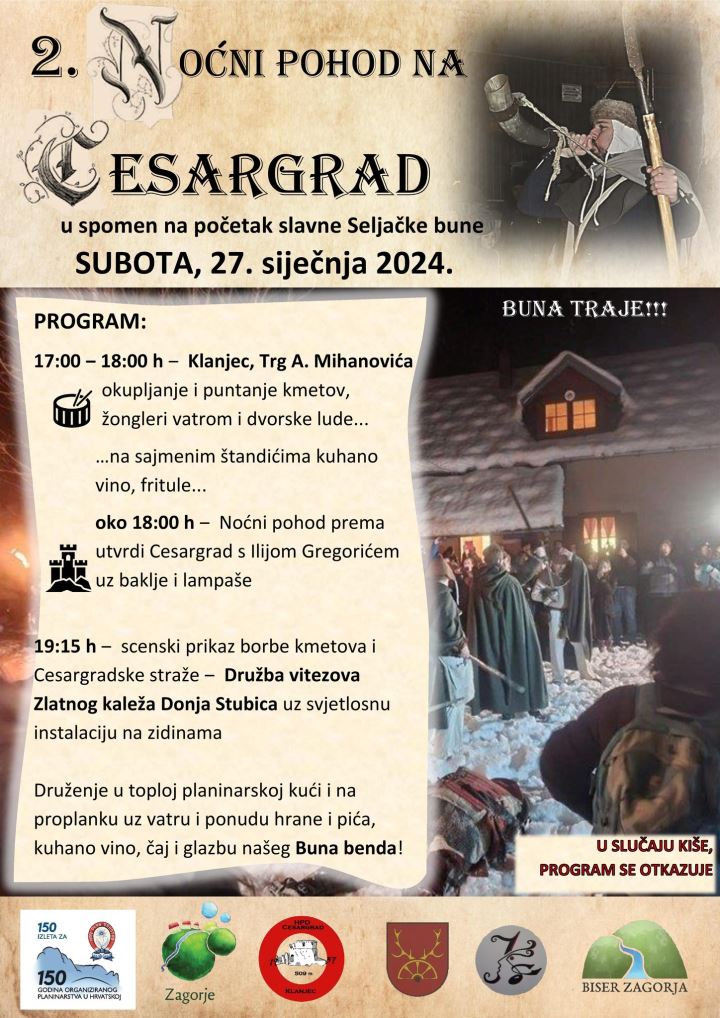 - Ovogodišnji Noćni pohod je i u godini kada obilježavamo 150 godina organiziranog planinarenja u Hrvatskoj tako da je i ovaj pohod uvršten u program '150 izleta za 150 izleta'. Samo događanje će se organizirati na dvije lokacije, na trgu Antuna Mihanovića u Klanjcu te na Cesargradu, prema kojem ćemo krenuti oko 18 sati. Nakon uprizorenja bitke slijedi druženje za sve posjetitelje kod planinarskog doma – najavila je Smolčić i dodala da je sama staza lagana za rekreativce, ali i za djecu i starije osobe.