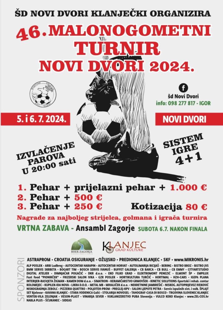 U organizaciji ŠD Novi Dvori u Novim Dvorima Klanječkim ovaj petak i subotu (5. i 6. srpnja 2024.) održat će se već 46. izdanje najpoznatijeg i najposjećenijeg malonogometnog turnira u klanječkom kraju.