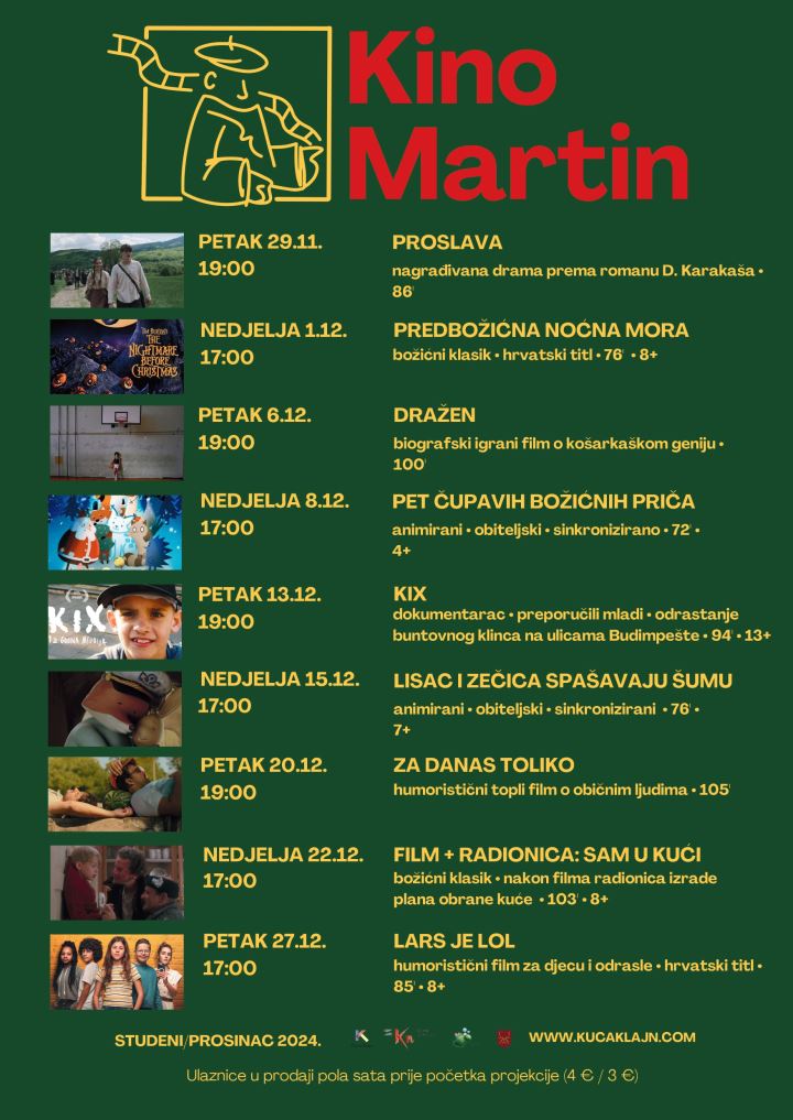 Sve detalje o programu i filmovima možete pratiti na www.kucaklajn.com i društvenim mrežama Kuće Klajn. Provedba programa kina Martin sufinancirana je sredstvima Zaklade Kultura Nova i Grada Klanjca.