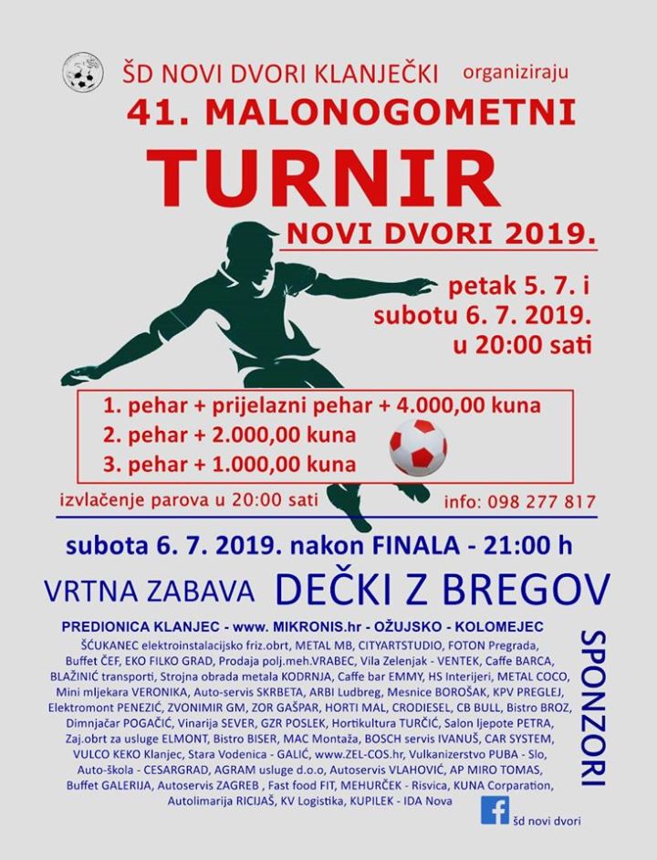Ovog vikenda očekuje nas već 41. izdanje malonogometnog turnira Novi Dvori u organizaciji istoimenog športskog društva. Odličan nogomet, puno ekipa, privlačan nagradni fond i izvrsna zabava za posjetitelje na igralištu i u parku Novih Dvora u petak, 5. srpnja i subotu, 6. srpnja od 20 sati.