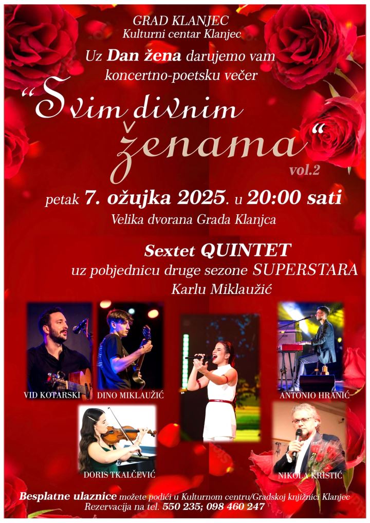 Uz Međunarodni dan žena Grad Klanjec i Kulturni centar Klanjec daruju svim dragim sugrađankama i svim ljubiteljicama, ali i ljubiteljima glazbe, koncertno-poetsku večer „SVIM DIVNIM ŽENAMA“ vol. 2. i to u petak 7. ožujka u 20:00 sati u Velikoj dvorani Grada Klanjca.