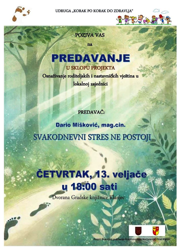 Klanječka udruga “Korak po korak do zdravlja” nastavlja i u ovoj godini s aktivnostima u okviru projekta “Osnaživanje roditeljskih i nastavničkih vještina u lokalnoj zajednici”, ali ovaj put, uz roditelje, nastavnike i odgojitelje, poziva i sve druge zainteresirane građane na javno predavanje pod nazivom “Svakodnevni stres ne postoji” koje će u četvrtak 13. veljače s početkom u 18 sati u dvorani Gradske knjižnice u Klanjcu održati Dario Mišković, mag. cin.