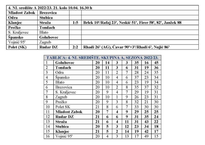 U derbiju začelja IV. NL središte Zagreb skupina A u 21. kolu snage su odmjerili Klanjec i Straža. Gosti su bili puno bolji protivnik, osobito u nastavku i na kraju su zasluženo slavili s 5:1 u režiji bivšeg slovenskog reprezentativca i velemajstora nogometa Ivana Firera. Iako je u 38. godini ovaj nogometaš još zadivljuje svojem potezima i užitak ga je gledati.