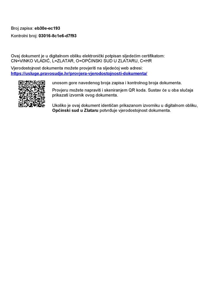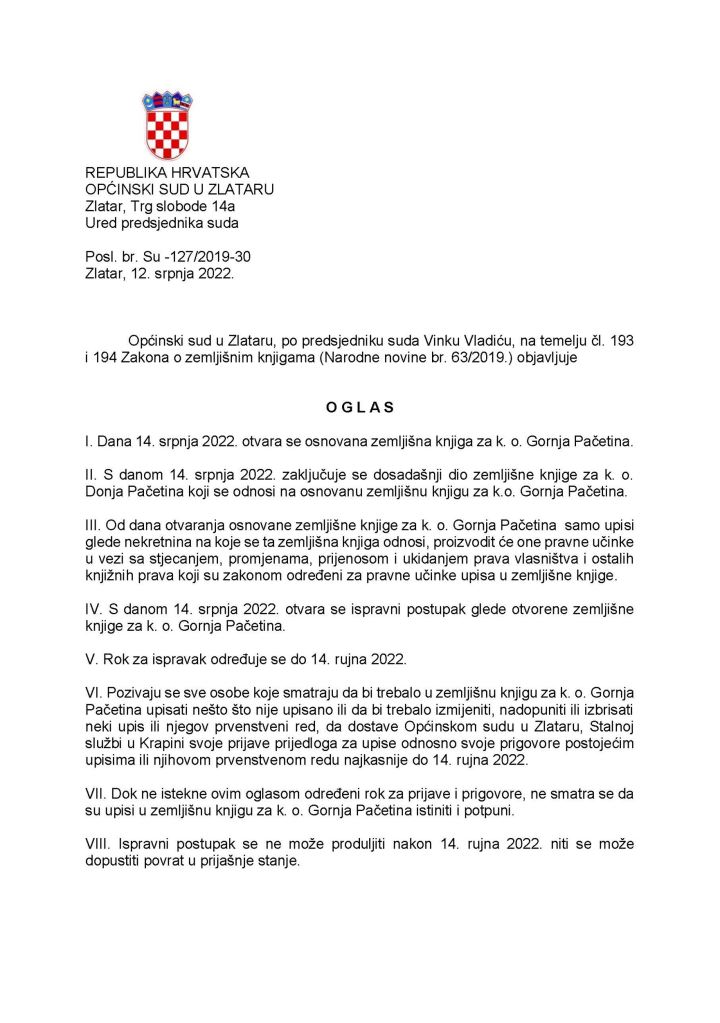 Dana 14. srpnja 2022. otvara se osnovana zemljišna knjiga za k.o. Gornja Pačetina. S danom 14. srpnja 2022. zaključuje se dosadašnji dio zemljišne knjige za k. o. Donja Pačetina koji se odnosi na osnovanu zemljišnu knjigu za k.o. Gornja Pačetina. Od dana otvaranja osnovane zemljišne knjige za k. o. Gornja Pačetina samo upisi glede nekretnina na koje se ta zemljišna knjiga odnosi, proizvodit će one pravne učinke u vezi sa stjecanjem, promjenama, prijenosom i ukidanjem prava vlasništva i ostalih knjižnih prava koji su zakonom određeni za pravne učinke upisa u zemljišne knjige. S danom 14. srpnja 2022. otvara se ispravni postupak glede otvorene zemljišne knjige za k. o. Gornja Pačetina. Rok za ispravak određuje se do 14. rujna 2022. Pozivaju se sve osobe koje smatraju da bi trebalo u zemljišnu knjigu za k. o. Gornja Pačetina upisati nešto što nije upisano ili da bi trebalo izmijeniti, nadopuniti ili izbrisati neki upis ili njegov prvenstveni red, da dostave Općinskom sudu u Zlataru, Stalnoj službi u Krapini svoje prijave prijedloga za upise odnosno svoje prigovore postojećim upisima ili njihovom prvenstvenom redu najkasnije do 14. rujna 2022.