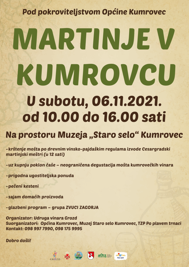U Kumrovcu se 6. studenog s početkom u 10 sati, pod pokroviteljstvom Općine Kumrovec, priprema tradicionalna proslava "Martinja" po starim vinsko-pajdaškim regulama uz bogatu gastronomsku i vinsku ponudu. - Degustaciju mošta i vina pratit će glazbeni program grupe "Zvuci Zagorja" u prekrasnom ambijentu kod "Zagorske kleti" u muzeju "Staro selo" Kumrovec – kažu organizatori.