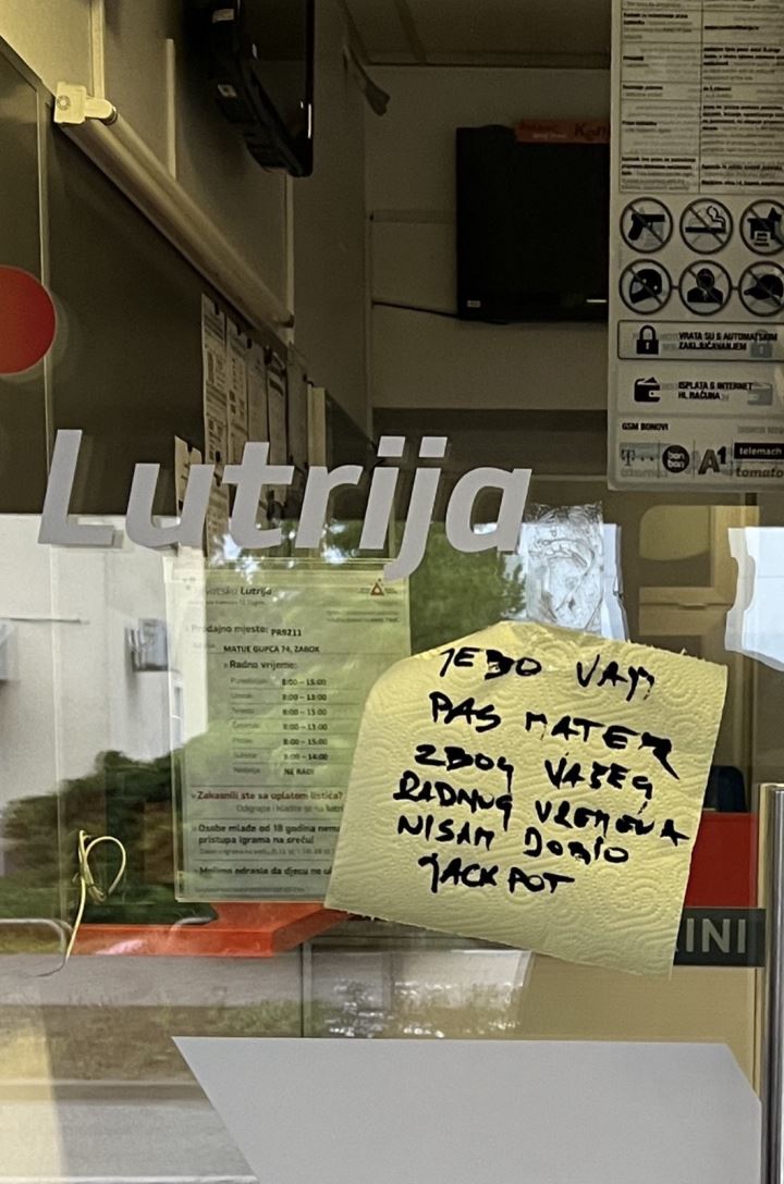Srijeda je dan kad se, po već ustaljenom rasporedu, izvlače brojevi u igri lota 7/35 Hrvatske lutrije. Jedan je Zagorec očito bio potpuno siguran da će ove srijede biti izvučeni upravo njegovi brojevi te da će osvojiti Jackpot. No, izgleda da je zakasnio s uplatom listića te stigao pred jednu od zabočkih poslovnica Hrvatske lutrije nakon što je završilo njeno radno vrijeme. Stoga je, očito potpuno bijesan, napisao ljutitu poruku Hrvatskoj lutriji i zalijepio je na staklo, a poruku su mnogi prolaznici uz smijeh odmah proglasili urnebesnom. Pogledajte što im je napisao: