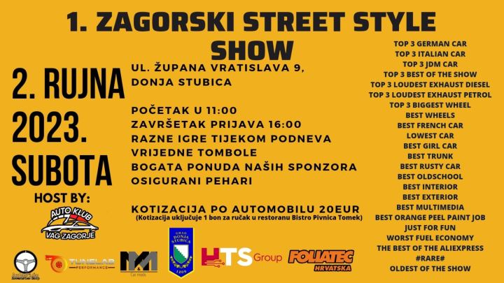 U Donjoj Stubici se sutra, u subotu, 2. rujna, održava 1. zagorski street style show, u organizaciji Autokluba Vag Zagorje.