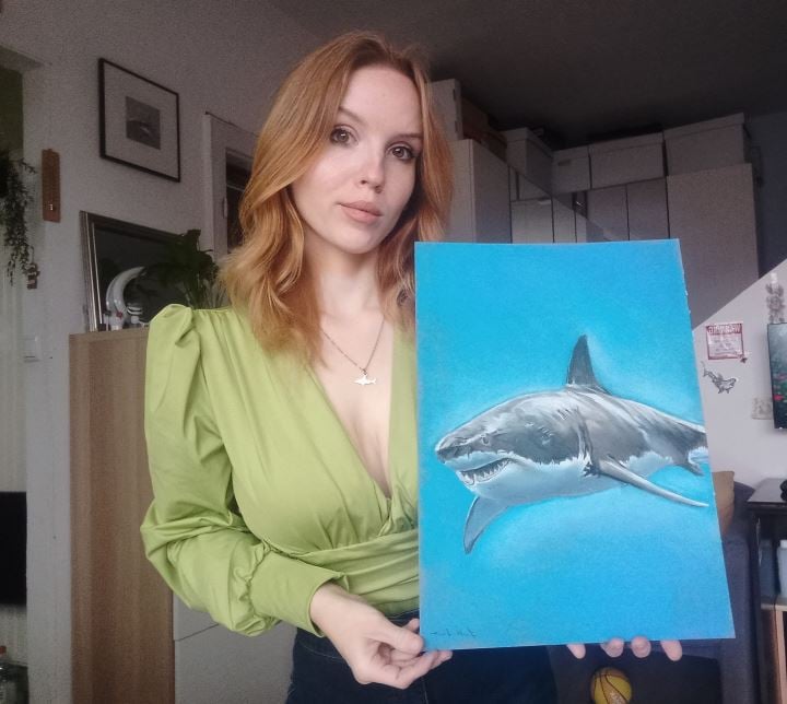 - Svoje radove sam počela objavljivati javno prije nešto više od godinu dana. Nisam crtala jedan duži period, no kako je došla korona, počela sam se nalaziti u tome. Htjela sam postići više, htjela sam napredovati, vidjeti dokle mogu doći. Razlog zbog kojeg sam počela objavljivati je, između ostalog, da mi bude motivirajuće za dalje jer uz kontinuirano objavljivanje uočavam napredak u svojim radovima i to me gura naprijed. Javno objavljivanje može pronaći jako puno ljudi, a nikad ne znaš tko se nalazi među njima, kakve prilike ti se sve mogu pružiti. Izazov je istaknuti se, biti poseban u masi, dati ljudima nešto drukčije što će ih potaknuti da te prate. Na društvenim mrežama ima jako puno umjetnika koji pomoću svojeg profila educiraju druge. Mogu se naći vrlo korisni savjeti. Pritom nisu u pitanju samo Facebook, Instagram. Tu dolazi i Pinterest, Youtube... Istovremeno se inspiriraš i učiš - priča nam Funtek koja još nije imala prilike izlagati javno, odnosno imati svoju izložbu jer, kako kaže, nije jednostavno i smatra da se trud i vrijeme uloženo u umjetnost ne cijeni dovoljno. Najčešći motiv na njenim djelima su morski psi i životinje općenito. Najzastupljenija tehnika je crtanje uljanim, odnosno pastelnim bojicama, a cilj joj je proširiti svoje znanje i na ostale tehnike, kao što su slikanje akrilnim bojama, akvarelom. A prije svakog crtanja, Funtek ima ritual.