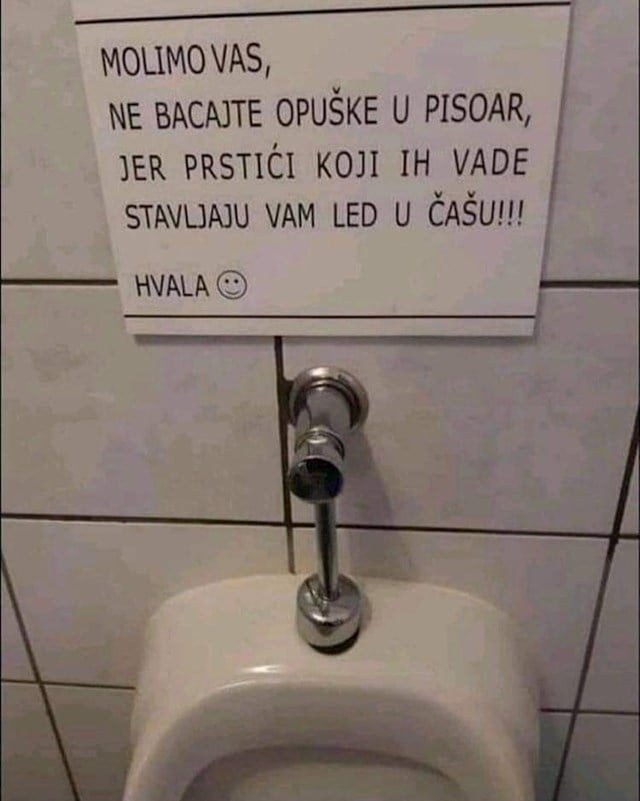 "Molimo vas, ne bacajte opuške u pisoar, jer prstići koji ih vade stavljaju vam led u čašu", stoji u duhovitoj poruci.