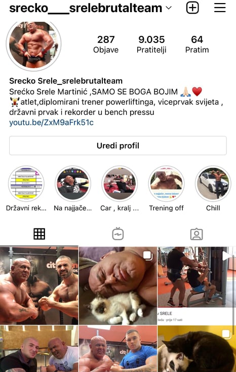 Najjači zagorski policajac, 48-godišnji Srećko Martinić Srele iz Oroslavja, diplomirani trener powerliftinga, državni prvak i viceprvak svijeta u bench pressu, mnogima naoko izgleda grubo, kako izgledom, tako ponekad i svojim nastupom. Ipak, Srele svojim pratiteljima na društvenim mrežama nerijetko otkriva i svoju toplu, humanu stranu, posebno kad je u pitanju ljubav prema životinjama, ponajviše mačkama. Posebno je aktivan na Instagramu, na kojem ima preko 9 tisuća pratitelja, a na kojem redovito objavljuje fotografije i video snimke svojih ljubimaca.