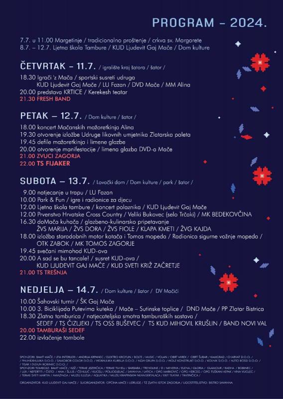 Tamburaška noć u Maču ove godine održat će se od 11. do 14. srpnja. Manifestaciju organizira KUD „Ljudevit Gaj” pod pokroviteljstvom Općine Mače i uz pomoć ostalih tamošnjih udruga. Aktivnosti će se odvijati na nekoliko lokacija u užem centru Mača, a glavni sadržaji u šatoru kod nogometnog igrališta. Uvod u tamburaški tjedan je proštenje u crkvi sv. Margarete u Peršavesi, a pplanirani su brojni zanimljivi sadržaji, dok će se glavna priredba, natjecanje za Zlatnu tamburicu, održati u nedjelju 14. srpnja s početkom u 18.30 sati.