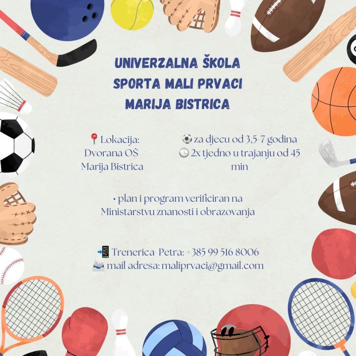 U Mariji Bistrici uskoro kreće nova aktivnost za predškolsku djecu. Riječ je o univerzalnoj školi sporta za djecu od tri i pol do sedam godina – Mali prvaci. Treninzi će se održavati utorkom i četvrtkom od 17 sati u Dvorani OŠ Marija Bistrica, u trajanju po 45 minuta svaki, a s djecom će raditi isključivo kineziolozi.