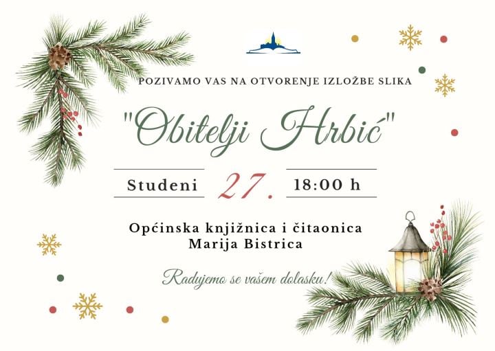 Općinska knjižnica i čitaonica Marija Bistrica organizira u četvrtak 27. studenoga otvorenje izložbe obitelji Hrbić. Slikarica Nedjeljka Hrbić izlaže većinu djela, zajedno sa suprugom Rajkom i kćerkom Rajkom. Izlaže dvadesetak godina, na skupnim i samostalnim izložbama, uglavnom krajolike, vedute i florealne motive, intimističkog narativa s bogatim i pastuoznim rukopisom. Njena djela, uglavnom ulja na platnu, odišu vedrinom i realističnom točnošću.