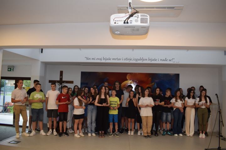 Prošlog je četvrtka u Dvorani Božjeg milosrđa u Svetištu MBB održana završna priredba učenika osmih razreda nedavno završene školske godine u OŠ Marija Bistrica. Uz vodstvo svojih razrednica sad već bivši osmaši pripremili su program, koji se sastojao od oproštajnog sastavka i video materijala koji je zaokružio jednu veliku i važnu cjelinu u njihovom odrastanju, podsjetivši ih na 8 nezaboravnih godina osnovne škole.
