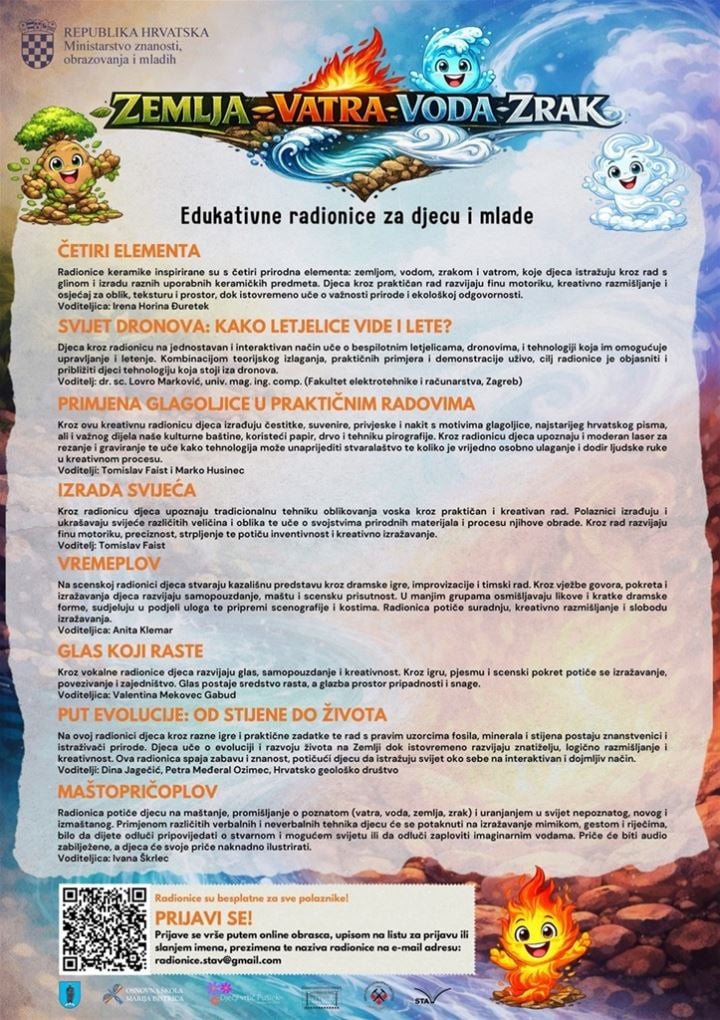 Ovaj raznolik program spaja umjetnost, znanost i tehnologiju, pružajući djeci prostor za učenje, istraživanje i slobodno izražavanje, te ih potiče na aktivno promišljanje svijeta koji ih okružuje. Poseban naglasak stavljen je na razvoj kreativnosti, praktičnih vještina i samopouzdanja u sigurnom i poticajnom okruženju, čime se djeci omogućuje kvalitetno provođenje slobodnog vremena. Uz praktični rad, predviđene su i vježbe fokusa te radionice usmjerene na ekološku svijest i očuvanje prirode. Projekt nudi i važnu potporu odraslima kroz stručna predavanja o očuvanju mentalnog i kardiovaskularnog zdravlja djece u izazovnom digitalnom dobu. O negativnim tendencijama sjedilačkog načina života i važnosti kognitivnog napora govorit će doc. dr. sc. Sanja Kovačić s KBC-a Sestre milosrdnice i prof. dr. sc. Gordana Keresteš s Filozofskog fakulteta u Zagrebu. Prijave za darovitu djecu osnovnoškolske dobi već su otvorene putem online obrasca na društvenim mrežama udruge, e-mail adrese [email protected] ili skeniranjem QR koda na službenim plakatima. Radionice za djecu s teškoćama u razvoju i predškolce, kao i predavanja za roditelje, organizirat će se u izravnoj suradnji s odgojno-obrazovnim ustanovama. Sve dodatne informacije bit će redovito objavljivane na Facebook stranici ''Udruga Stav'', a projekt financira Ministarstvo znanosti, obrazovanja i mladih u okviru programa za školsku godinu 2025./2026.