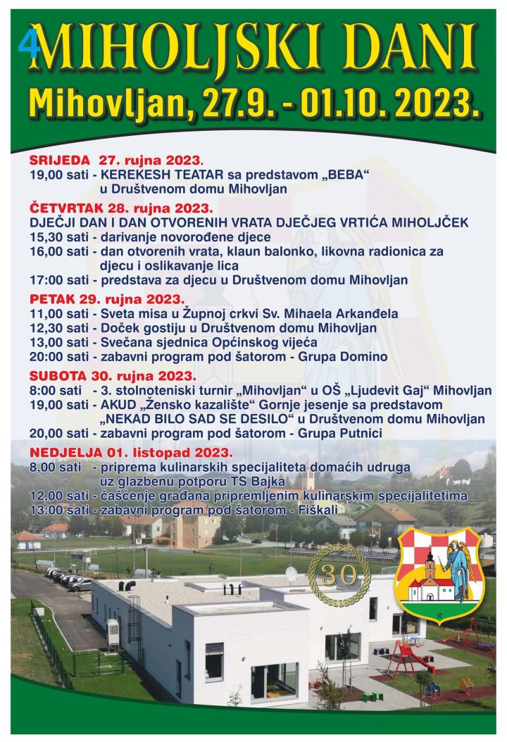 Utvrđen je program 'Miholjskih dana', koji će se održati od 27. rujna do 1. listopada povodom Dana općine i Župe Mihovljan. Program počinje kazališnom predstavom BEBA Kerekesh teatra u Društvenom domu u srijedu, 27. rujna od 19 sati. U četvrtak je Dječji dan i Dan otvorenih vrata Dječjeg vrtiča Miholjček, u sklopu kojega će biti darivanje novorođene djece, prigodni program u vrtiću i predstava za djecu u Domu.