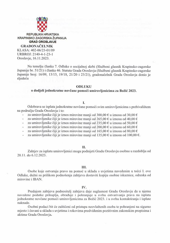 Gradonačelnik Oroslavja Viktor Šimunić donio je odluku o dodjeli jednokratne novčane pomoći umirovljenicima za Božić. Božićnica će biti isplaćena svim umirovljenicima s područja grada Oroslavja i to 30 eura za one čije su mirovine manje od 300 eura, zatim 40 eura za one kojima mirovina ne prelazi 265 eura, 50 eura za one čija mirovina je manja od 235 eura, 60 eura za one čija mirovina je manja od 200 eura, 80 eura za one čija je mirovina manja od 165 eura te 100 eura za one čiji je iznos mirovine manji od 135 eura.