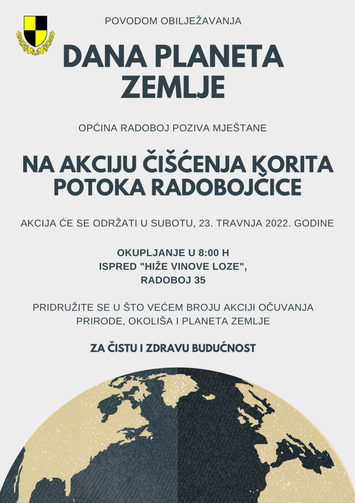 Povodom obilježavanja Dana planeta Zemlje, 22. travnja, Općina Radoboj organizira akciju čišćenja korita potoka Radobojčice. Akcija će se održati sutra 23. travnja a okupljanje sudionika je u 8 sati ispred Hiže vinove loze, Radoboj 35. - Za sve sudionike osigurane su rukavice, a sve što Vam treba je dobra volja. Pridružite se u što većem broju akciji očuvanja prirode, okoliša i planeta Zemlje – poručuju iz Općine Radoboj.