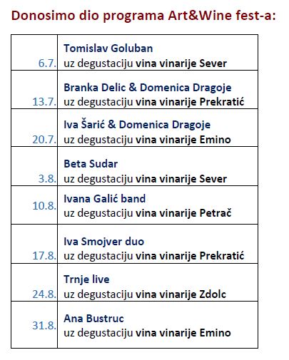 26. 7. od 20:00 h zabavu će rasplamsati popularni slovenski ženski sastav Navihanke, dok su za veliko finale 27. 7. zaduženi Kavaliri, DJ Nick i Mladen Grdović. Kroz obje festivalske večeri, gosti će moći uživati u odličnoj ponudi lokalnih specijaliteta kao i tržnici zagorskih proizvoda za koju će se pobrinuti lokalne udruge.