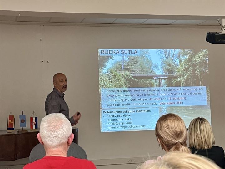 Prof. dr. sc. Marko Ćaleta predstavio je rezultate terenskog istraživanja provedenog na rijeci Sutli na području Krapinsko-zagorske županije, tijekom kojega su zabilježene 22 vrste riba iz 11 porodica. Od ukupnog broja vrsta njih 19 su autohtone, dok su tri alohtone i invazivne – bezribica, sunčanica i kalifornijska pastrva. Najbrojnija vrsta u uzorku bila je dvoprugasta uklija, koja čini više od polovice ukupno zabilježenih jedinki, što ukazuje na njezinu izrazitu dominaciju u zajednici.