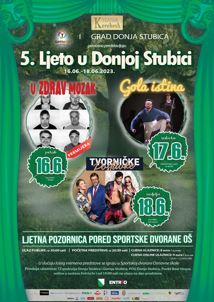 Ovogodišnje „5. Ljeto u Donjoj Stubici“ otvara premijera nove komedije Kerekesh Teatra – „U ZDRAV MOZAK“. Pacijenti neuropsihijatrijskog odjela koji su skrenuli s puta odlučili su vas iznenaditi jednim igrokazom i pokazati vam koliko su napredovali kroz terapije i kako kreativno provode vrijeme. Kakve sve (ne)zgode povezuju šest osoba koje su se pronašle na naizgled istom mjestu u isto vrijeme, provjerite već u petak, 16. lipnja.