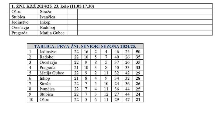 Ovoga vikenda nastavljaju se županijske nogometne lige NS KZŽ-e. Sve utakmice 1. zagorske lige igraju se u nedjelju u 17.30 sati. No i prije ovog kola, u tjednu su odigrane dvije utakmice 21. kola, koje se rastegnulo na tri termina, pa je tako još preostala utakmica Pregrade i Inkopa. A u odigranim utakmicama Matija Gubec je stigao do važne pobjede 2:1 protiv Radoboja, i zaustavio, već pomalo opasan pad na ljestvici. Vodeće Jedinstvo je sa 4:2 svladalo Ivančicu i već u srijedu otišlo na plus 15. U teoriji treba još bod za osiguranje naslova. Do njega će probati doći već u nedjelju protiv Inkopa i to na domaćem terenu. U 23. kolu dvije su važne utakmice u borbi za opstanak. Stubica dočekuje Ivančicu, a Oštrc je domaćin Straži. Oštrc gotova da nema pravi na poraz, a i bod se čini malo. Utakmica za drugo mjestu igra se u Oroslavju, gdje istoimeni domaćin dočekuje Radoboj. Pregrada je pak domaćin Matiji Gupcu.