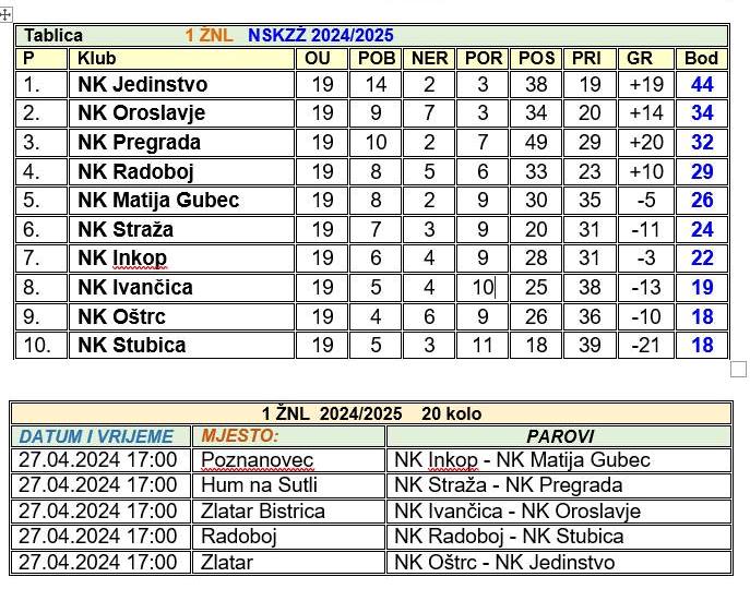 Ovoga vikenda nastavljaju se županijske nogometne lige NS KZŽ-e. Sve utakmice 1. zagorske lige igraju se u nedjelju u 17 sati. U 20. kolu vodeće Jedinstvo gostuje kod Oštrca, a vrlo zanimljivo bi moglo biti u utakmicama Ivančica – Oroslavje i Straža – Pregrada. Stubica opet ima teško gostovanje, kod Radoboja, a Inkop će dočekati Matija Gubec. Utakmice se igraju u nedjelju 27. travnja u 17 sati.