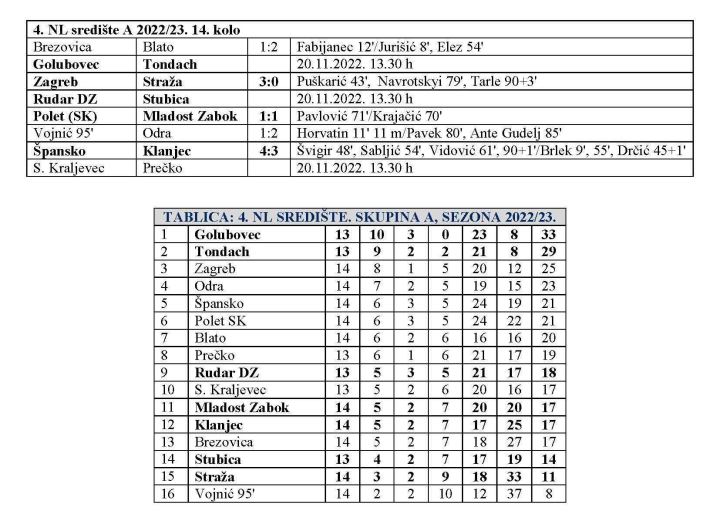 Nakon što je jučer Klanjec nes(p)retno poražen kod Španskog, danas su odigrane još četiri utakmice 14. kola 4. NL središte Skupina A. Straža je u prijepodnevnom terminu gostovala kod Zagreba. Slavili su domaćini sa 3:0. Nešto kasnije igrala je Mladost Zabok, kod Poleta u Svetoj Klari i donijela bod, odigravši 1:1. Preostale dvije današnje utakmice završile su pobjedama gostiju 2:1. Blato je slavilo kod Brezovice, a Odra kod Vojnića 95'. Sutra su na rasporedu tri utakmice, sve tri u 13.30 sati, a dvije od njih su zagorski derbiji. Osim što ima epitet zagorski, derbi u Novom Golubovcu je i najveći derbi jeseni, jer se sastaju dvije ekipe koje su pokazale najviše, Golubovec i Tondach. Golubovcu je za jesenski naslov dovoljan i bod, no ne zaboravimo da je Tondach prošle sezone slavio u obje utakmice. U Dubravi Zabočkoj sastaju se Rudar DZ i Stubica. Sezona Rudara je bolja, no u zadnje dvije utakmice nisu zabili gol, a Stubica se diže. Bit će zanimljivo. Sutra još Sesvetski Kraljevec dočekuje Prečko.