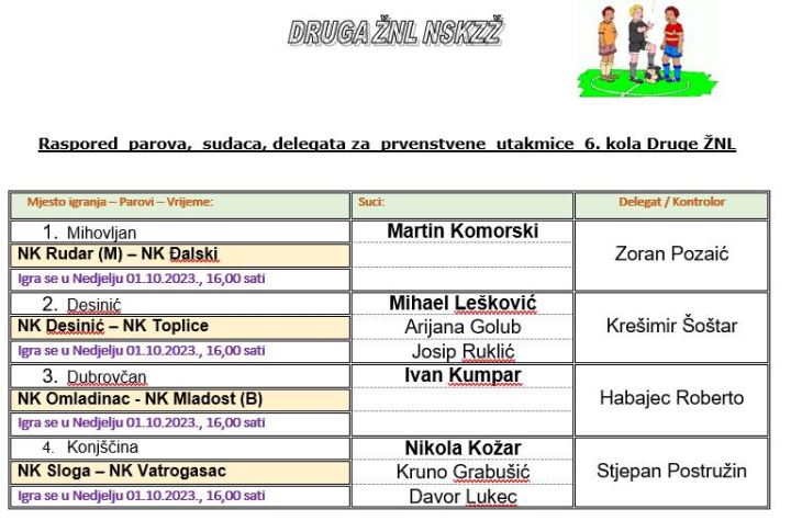 U 2. zagorskoj ligi na rasporedu je također 6. kolo, no odigrat će se tri utakmice, jer su utakmice Sloga - Vatrogasac i Lobor – Milengrad 2005. pomaknute za 12. studeni. Rudar M je domaćin Đalskom, Omladinac će biti domaćin Mladosti iz Belca, a Toplice pak dočekuju Desinić. Slobodan je Matija Gubec. Utakmice se igraju također s početkom u 16 sati.