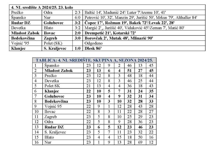 Odigrano je 23. kolo 4. NL središte skupina A. jedna utakmica nije odigrana, a razloge tragične prirode. U petak navečer, nakon povratak s treninga tragično je u prometnoj nesreći stradao Nikola Pokrivač, trenutno igrač NK Vojnića '95, koji stoga nije igrao utakmicu ovog kola protiv Poleta (SK). Ostale su utakmice odigrane i nakon njih na vrhu je ogroman gužva. Iz zagorskog kuta gledano bilo je ovo odlično kolo, sa četiri pobjede zagorskih predstavnika. Više ih ni nije moglo biti, jer je na rasporedu bio i zagorski derbi, u kojem je Rudar DZ sa 3:2 pobijedio Golubovec i stigao do jako važne pobjede. Još u petak Mladost Zabok je sa 2:0 pobijedila Ilovac, a danas su domaće pobjede slavili i Klanjec i Bedekovčina. Klanjec je sa 1:0 dobio Sesvetski Kraljevec, a Bedekovčina je sa 3:0 pobijedila Zagreb. Time su izravno pomogli i Rudaru u borbi za opstanak. Senzacija se dogodila još u četvrtak, kada je Odra slavila kod tada još vodećeg Prečkog 3:2. Špansko danas nije imalo problema protiv zadnjeg Nura. Bilo je 6:0, a Devetka je sa 3:2 dobila blato. Takav je rasplet donio veliku gužvu na vrhu, jer su četiri ekipe u samo dva boda. Špansko i Mladost Zabok imaju po 45, a Prečko i Devetka po 44 boda. Ali tu je i Polet (SK) sa 43 boda, ali i čak dvije utakmice manje. Ta se petorka bori za naslov. Nakon njih dolazi zagorska trojka. Klanjec je na šestom mjestu sa 35 bodova i utakmicom manje, a iza njega su Golubovec sa 34 i Bedekovčina sa 33 boda. Rudar DZ je skočio na 13. mjesto sa 23 boda, koliko imaju i Odra (sa utakmicom manje) i Zagreb. U 24. kolu nema na rasporedu zagorskih derbija, a od zagorskih klubova samo će Golubovec biti domaćin. U subotu dočekuje Špansko (17.30 h). Već u petak na teško gostovanje će Bedekovčina, kod Poleta u Svetu Klaru. I Špansko i Polet su u borbi za sam vrh, pa Golubovec i Bedekovčina mogu pomoći nekom dobrim rezultatima i Mladosti iz Zaboka, koja je također u borbi za vrh, a u 24. kolu gostuje kod Zagreba u subotu u 10 sati. Rudar DZ ima iznimno važno gostovanje kod Blata, u subotu u 17.30. Riječ je o izravnoj borbi za opstanak. Kolo će zaključiti u nedjelju u 17.30 Odra i Klanjec. Klanjec bi pobjedom malo pomogao i Rudaru DZ, jer je i Odra u borbi za opstanak.