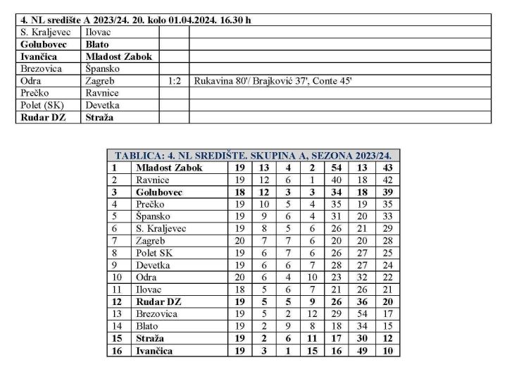 Danas se igra sedam od osam utakmica 20. kola 4. NL središte skupina A. Još u srijedu Zagreb je slavio kod Odre 2:1, a sve ostale utakmice igraju se danas u 16.30 sati. Ovo kolo donosi čak dva zagorska derbija. Ivančica će u Zlatar Bistrici dočekati vodeću Mladost iz Zaboka, dok će u Dubravi Zabočkoj Rudar biti domaćin Straži. Golubovec će ugostiti Blato. Danas se još sastaju: Sesvetski Kraljevec – Ilovac, Brezovica – Špansko, Prečko – Ravnice i Polet (SK) – Devetka.