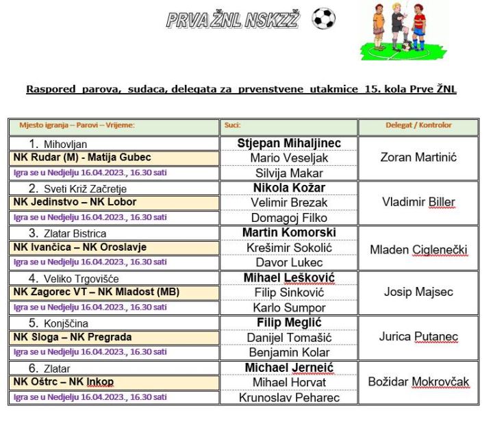 Danas je na rasporedu 15. kolo 1. i 2. zagorske nogometne lige. U 15. kolu 1. lige derbi se igra u Zlatar Bistrici, gdje Ivančica dočekuje Oroslavje. Pregrada, sa novim trenerom Draženom Kovjanićem gostuje kod Sloge, a Oštrc dočekuje Inkop, dok će Jedinstvo biti domaćin Loboru. U važnim utakmicama za opstanak Zagorec VT dočekuje Mladost MB, a Rudar M Matija Gubec. Utakmice se igraju u 16.30 sati.
