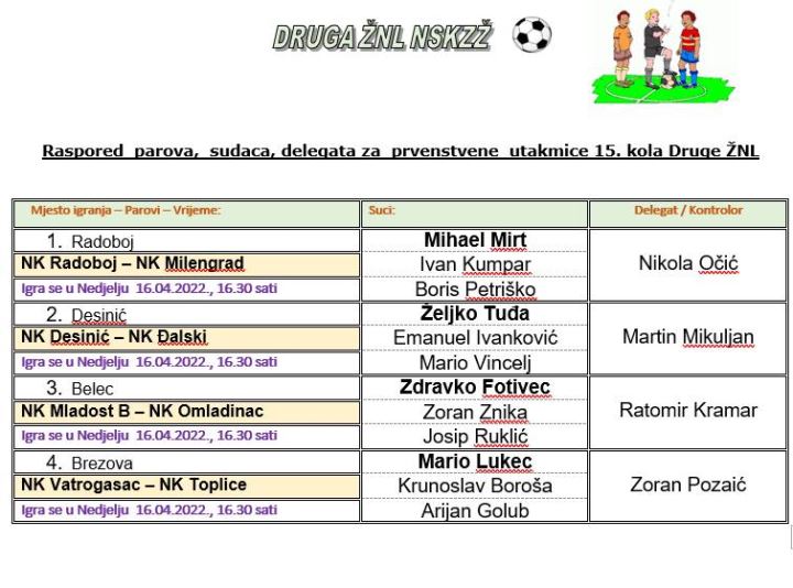 I u 2. zagorskoj ligi na rasporedu je 15. kolo, a to je ustvari početak trećeg kruga natjecanja, koje se ove sezone odvija trokružno. Raspored je napravljen ponovno, na način da su natjecateljske brojeve dobili klubovi prema stanju na ljestvici nakon 14. kola. Tako će danas u 15. kolu igrati: Radoboj - Milengrad 2005., Desinić - Đalski, Mladost B - Omladinac i Vatrogasac – Toplice. Utakmice se igraju u 16.30 sati.