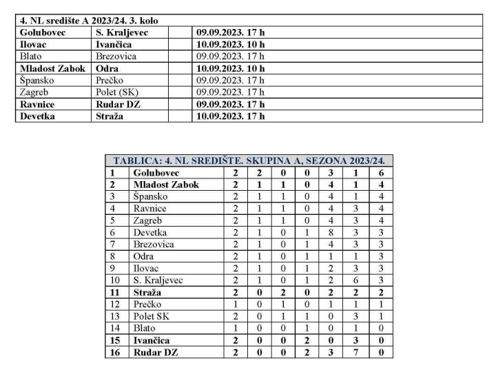 Danas kreće 3. kolo 4. NL središte skupina A. Kolo je to bez zagorskih derbija. Domaće utakmice igrat će Golubovec, koji danas u 17 sati dočekuje Sesvetski Kraljevec i Mladost Zabok, koja sutra u 10 sati dočekuje Odru. Rudar DZ će na jako teško gostovanje kod Ravnica danas u 17 sati, Ivančica će sutra u 10 sati igrati kod Ilovca, a Straža će sutra u 17 sati gostovati kod Devetke. U ostalim utakmicama Blato dočekuje Brezovicu, Špansko je domaćin Prečkom, a Zagreb će dočekati Polet (SK).