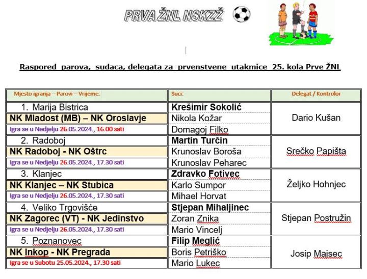 Već jučer je počelo 25. kolo u 1. zagorskoj nogometnoj ligi. Naime, Inkop je u malom derbiju dočekao Pregradu i slavio sa 2:1. No, prava uzbuđenja čekaju nas danas, naravno kad je u pitanju opstanak prije svega. Ipak, prvo naglasimo da se igra i jedan derbi s vrha ljestvice. Naime, vodeći Klanjec dočekuje drugoplasiranu Stubicu. Pitanje prvaka je već odavno riješeno, ali bit će to ipak zanimljiva utakmica. No još je zanimljivija borba za opstanak. Od četiri ugrožene ekipe, dvije imaju međusobnu utakmicu. Naime, Mladost u Mariji Bistrici dočekuje Oroslavje. I jedni i drugi su na 28 bodova, baš kao i Jedinstvo koje će u goste otpisanom Zagorcu VT, i Radoboj, koji dočekuje mirni Oštrc. Utakmica u Mariji Bistrici počinje u 16, a ostale u 17.30 sati.