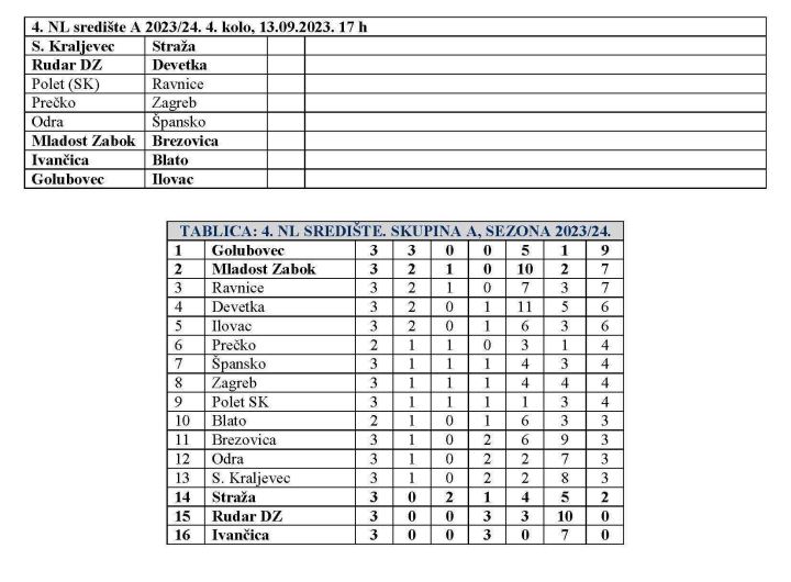 Danas se igra 4. kolo 4. NL središte skupina A. Vodeći Golubovec, jedina ekipa koja je u prva tri kola ostvarila sve pobjede, dočekat će Ilovac, koji je krenuo vrlo dobro u sezonu sa šest bodova iz tri susreta, no Golubovčani traže naravno novu pobjedu. I drugoplasirana Mladost iz Zaboka danas će igrati domaću utakmicu, dočekuje Brezovicu, koja je na proljeće bila sjajna, ali u jesenski dio nije krenula prema očekivanjima. Kod kuće će igrati i jedine dvije ekipe bez bodova u prva tri kola. Ivančica će u Zlatar Bistrici dočekati Blato, a Rudar u Dubravi Zabočkoj bit će domaćin Devetki, pa ni jednima ni drugima neće biti lako, a bodovi sad već jako trebaju. Jedini zagorski predstavnik, koji u ovo kolu gostuje jest Straža, koja će gostovati kod Sesvetskog Kraljevca. Straži je to već treće gostovanje u prva četiri kola, do sad je sakupila dva boda, a u svakoj utakmici je imala i te kako svoje šanse za pobjedom. Današnji domaćin ima smao bod više od Straže, pa ne treba govoriti koliko bi važna bila eventualna pobjeda. Sve utakmice danas se igraju u 17 sati.