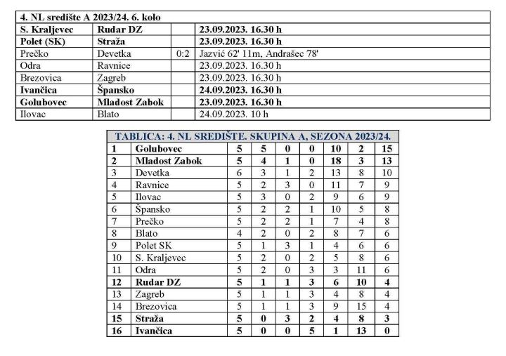Već sinoć utakmicom u Prečkom, u kojoj je Devetka svladala domaće Prečko sa 2:0, počelo je 6. kolo 4. NL središte skupina A. Veliki trenutak ovog kola za cijelu ligu je danas, kada je na rasporedu veliki derbi, utakmica dvije vodeće, do sada neporažene momčadi. Ujedno je to i veliki zagorski derbi. U Novom Golubovcu, u 16.30 sati Golubovec dočekuje Mladost Zabok. Domaćini sa svih pet pobjeda, gosti tek sa jednim remijem, dovoljno velika pozivnica za ovaj okršaj. Jedino što ne valja je prognoza, no na to ne možemo utjecati. I jedni i drugi su u srijedu rutinski odradili osminu finala zagorskog kupa, čime su osigurali i još jednu međusobnu utakmicu, u četvrtfinalu kupa 4. listopada. Nakon međusobnog derbija Straža i Rudar DZ će u ovom kolu goste, Straža kod Poleta (SK), Rudar DZ kod Sesvetskog Kraljevca. I ove dvije utakmice igraju se danas u 16.30 sati. Ivančica će prve bodova tražiti u domaćoj utakmici protiv Španskog sutra u 16.30 sati. Evo svih parova ovog kola i aktualne ljestvice: