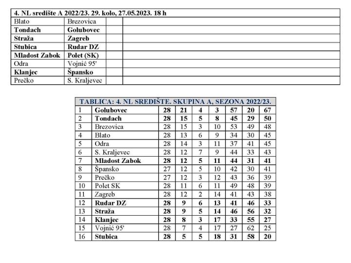 Iako je pitanje prvaka riješeno, daleko do toga da neće biti zanimljivo i u zadnja dva kola 4. NL središte skupina A. Danas je na rasporedu 29. kolo, a sve se utakmice igraju u 18 sati. Na rasporedu su dva zagorska derbija. U Bedekovčini Tondach će dočekati Golubovec. S obzirom da se Tondach u srijedu vratio na 2. mjesto, nakon pobjede u zaostaloj utakmici protiv Brezovice, bit će ovo susret dvije vodeće ekipe, s tim da je Golubovec odavno osigurao naslov. U drugom zagorskom derbiju Stubica će dočekati Rudar DZ. Još tri utakmice igraju se u Zagorju, Mladost Zabok dočekuje Polet (SK), Straža Zagreb, a Klanjec Špansko.