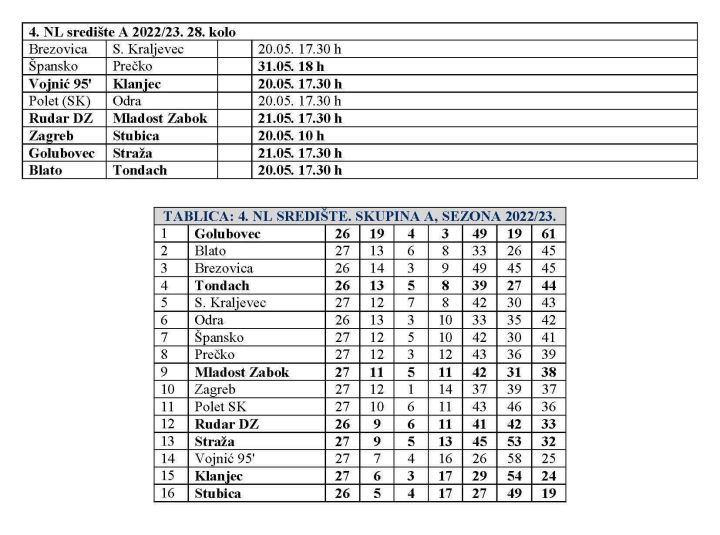 Pred nama je i 28. kolo 4. NL središte skupina A. Većina utakmica odigrat će se danas, no dva zagorska derbija na rasporedu su sutra. Tako će u Dubravi Zabočkoj, zagorski ali i gradski derbi odigrati Rudar DZ i Mladost Zabok. Bit će to vrlo zanimljiva utakmica, jer i jedni i drugi u zadnje vrijeme pružaju vrlo dobre igre. Zanimljiv će biti i drugi zagorski derbi u kojem vodeći Golubovec dočekuje Stražu, koja u zadnje vrijeme igra u sjajnoj formi i niže pobjede protiv ekipa odmah iza Golubovca na ljestvici, pa će biti zanimljivo vidjeti koliko može protiv prvaka. Ostali zagorski predstavnici igraju danas i to u gostima. Prva će na teren Stubica, već u 10 sati kod Zagreba. Stubica je u gotovo bezizlaznoj situaciji, no dok se igra treba vjerovati. Klanjec pak ima jako važnu utakmicu kod Vojnića '95. Riječ je u izravnoj borbi za opstanak. Na predzadnjem mjestu Klanjec zaostaje samo bod za svojim današnjim domaćinom, pa ne treba posebno govoriti o važnosti utakmice. Tondach će pak danas u derbiju vrha, u borbi za drugo mjesto gostovati kod Blata. Evo svih parova ovog kola, uz napomenu da će Špansko i Prečko igrati tek 31. svibnja.