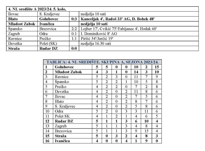 Jučer je odigrano pet utakmica 5. kola 4. NL središte skupina A. Vodeći Golubovec i dalje ruši sve pred sobom. Ovaj puta, za petu pobjedu zaredom palo je Blato i to u Blatu. Bilo je 3:0 za Golubovec koji će tako sa prvog mjesta i maksimalnih 15 bodova dočekati veliki derbi protiv Mladosti iz Zaboka, koji se igra u subotu 23. rujna u 16.30 u Novom Golubovcu. Da bi Mladost na derbi stigla sa samo dva oda manje morat će danas u zagorskom derbiju dobiti zadnju Ivančicu. Utakmica se igra već u 10 sati. A jedan zagorski derbi odigran je jučer. Straža i Rudar DZ igrali su bez golova, s tim da je domaći junak golman Drašković, koji je skinuo penal Cujzeku. Jučer su još dvije utakmice završile bez pobjednika: Špansko – Brezovica 2:2 i Ravnice – Prečko 1:1, dok je Odra kao gost svladala Zagreb 1:0. Danas će u 10 još igrati Ilovac – Sesvetski Kraljevec, dok će kolo zaključiti u 16.30 sati Devetka i Polet (SK).