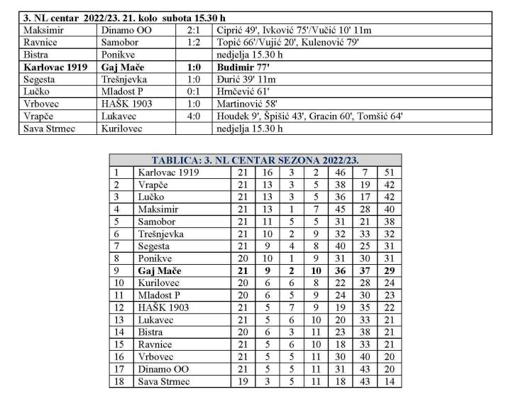 Danas je odigrana većina utakmica 3. NL centar i SuperSport 2. NL. Gaj Mače je u 21. kolu 3. NL centar gostovao kod vodećeg Karlovca 1919. i izgubio minimalno. Utakmicu je u 77. minuti riješio Budimir. Lučko je poraženo pa Karlovac grabi ka naslovu. Dvije se utakmice igraju sutra