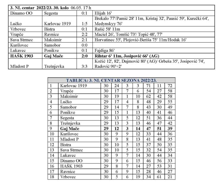 Gaj Mače je u 30. kolu 3. NL centar gostovao kod HAŠKA 1903. Kako se sezona bliži kraju Gaj ima sve više problema sa kadrom, što zbog ozljeda, što zbog kartona, pa je i u ovu utakmicu ušao vidno oslabljen. HAŠK 1903 se pak bori za opstanak, za bijeg sa dna pa mu je svaka pojeda i te kako važna. HAŠK je u odlično ušao u utakmicu, te je iz kaznenog udarac u 6. minuti poveo. Strijelac je bio Filip Rihtar. Sa 1:0 otišlo se na odmor, a utakmica je riješena u 66. minuti, nakon autogola Darija Josipovića, za konačnih 2:0. Pobjeda, koja puno znači HAŠKU, poraz koji nije zabrinjavajući za Gaj, koji će u četiri dana odigrati dvije utakmice. Prvo će već u srijedu odigrati zaostalu utakmicu 26. kola kod kuće protiv Ponikvi, da bi u nedjelju u 11 sati u 31. kolu dočekao Lukavec. Inače, Karlovac je 5:1 pobjedom kod Lučkog u ovom kolu otišao na 14 bodova prednosti, što znali da je osigurao naslov četiri kola prije kraja.