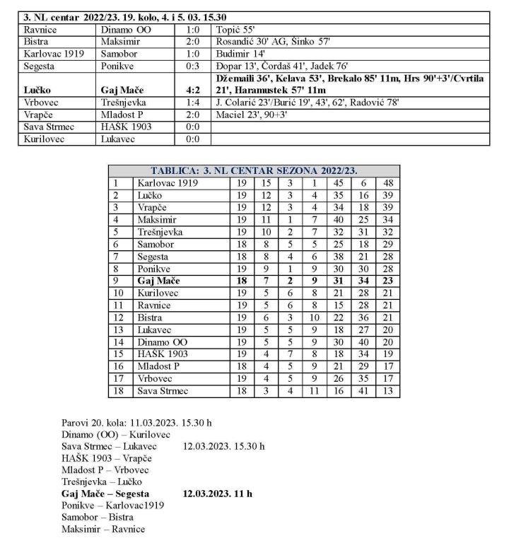 Poslije 19 odigranih kola Gaj drži devetu poziciju s 23 boda. Ovaj tjedan nogometaši trećeligaša iz Mača imaju dvostruki domaći program. Prvo u srijedu u 15.30 dočekuju Vrbovec u zaostaloj utakmici 18. kola, a već u nedjelju u 11 sati u Mače dolazi Segesta u redovnoj utakmici 20. kola.