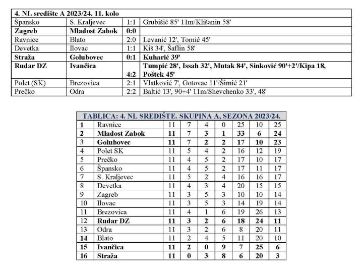 Za nama je 11. kolo u 4. NL središte skupina A, koje je donijelo dva zagorska derbija. No, donijelo je i pad Mladosti iz Zaboka sa vodeće pozicije. Mladostaši su kod Zagreba odigrali bez golova, a to nisu propustile Ravnice, koje su sa 2:0 svladale Blato i preuzele vodstvo sa 25 bodova, jedan više od Mladosti, a sve to pred međusobnu utakmicu u Zaboku. Golubovec je u zagorskom derbiju sa 1:0 slavio kod Straže i ima na trećem mjestu 23 boda, dakle prve tri ekipe u dva boda. U drugom zagorskom derbiju Rudar DZ je sa 4:2 pobijedio Ivančicu i skočio za dva mjesta, te je sada na 12. mjestu sa 11 bodova. Ivančica sa 6 i Straža sa 3 boda ostali su na samom dnu. U ostalim utakmicama inače još tri remija. Špansko – Sesvetski Kraljevec i Devetka – Ilovac igrali su 1:1, a Prečko – Odra 2:2. Polet )SK) Je pobijedio Brezovicu sa 2:1. U 12. kolu na rasporedu je još jedan zagorski derbi, ali i derbi dvije vodeće ekipe. Naime, Mladost u nedjelju u Zaboku dočekuje Ravnice. Zagorski derbi na rasporedu je u subotu u 14 sati. U Novom Golubovcu Golubovec će biti domaćin Rudaru DZ. Straža će u nedjelju u 10 sati gostovati kod Ilovca, dok će Ivančica u nedjelju u 14 sati dočekati Polet (SK).