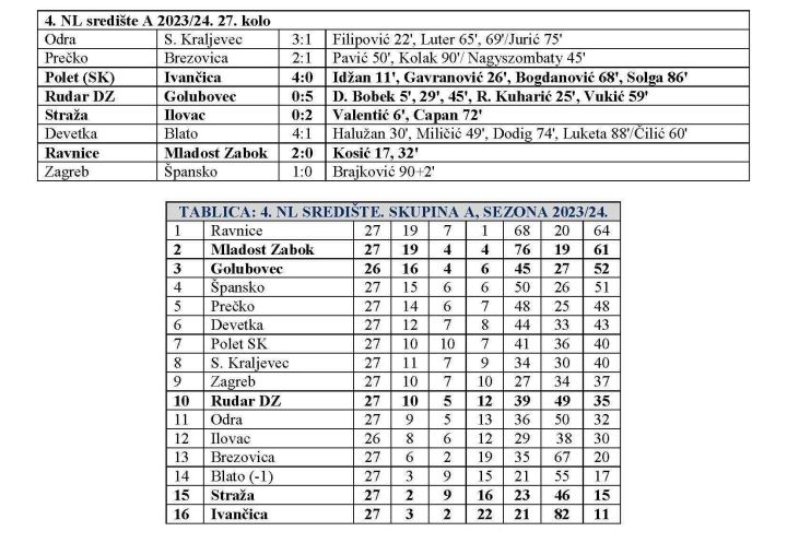 Završeno je 27. kolo 4. NL središte skupina A. Danas su odigrani tri utakmice. U zagorskom derbiju Golubovec je sa 5:0 slavio kod Rudara DZ, dok je Straža doživjela novi poraz, ovaj puta kod kuće od Ilovca 0:2. Danas je još Odra iznenadila Sesvetski Kraljevec sa 3:1.